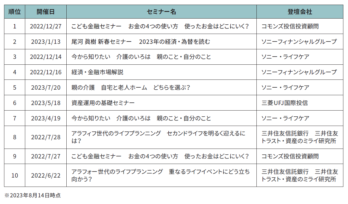 ・視聴数ランキングの1位はお子さま向けセミナー。介護や世代別のライフプランに関するセミナーも人気。
