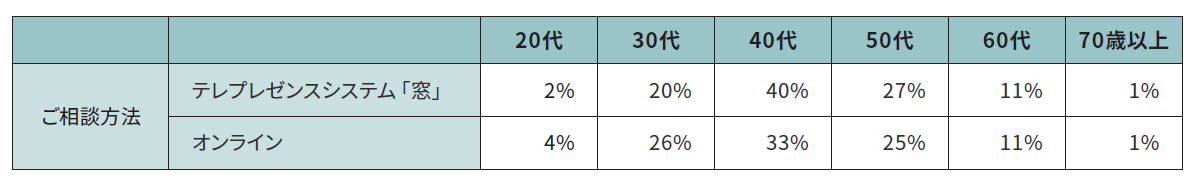 テレプレゼンスシステム「窓」を利用したお客さまは、40代のお客さまが最も多く40%を占めています。次いで50代のお客さまが27%という結果に。オンライン相談についても40代のお客さまが最も多い結果となりました。