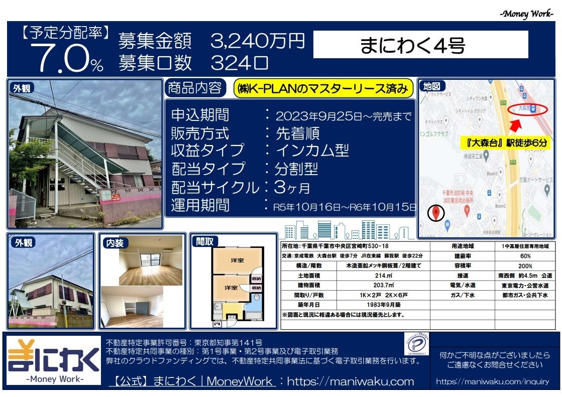 その管理ノウハウを用いて、多くの投資家の皆様に安全かつ収益性の高いファンドをご提案していきたいと考え、令和5年6⽉から事業スタートした投資用不動産クラウドファンディングの「まにわく」は1号ファンドから3号ファンドまでを募集開始当日に完売し、3号ファンドにおいては開始1分で出資申込みが満額まで到達致しました。