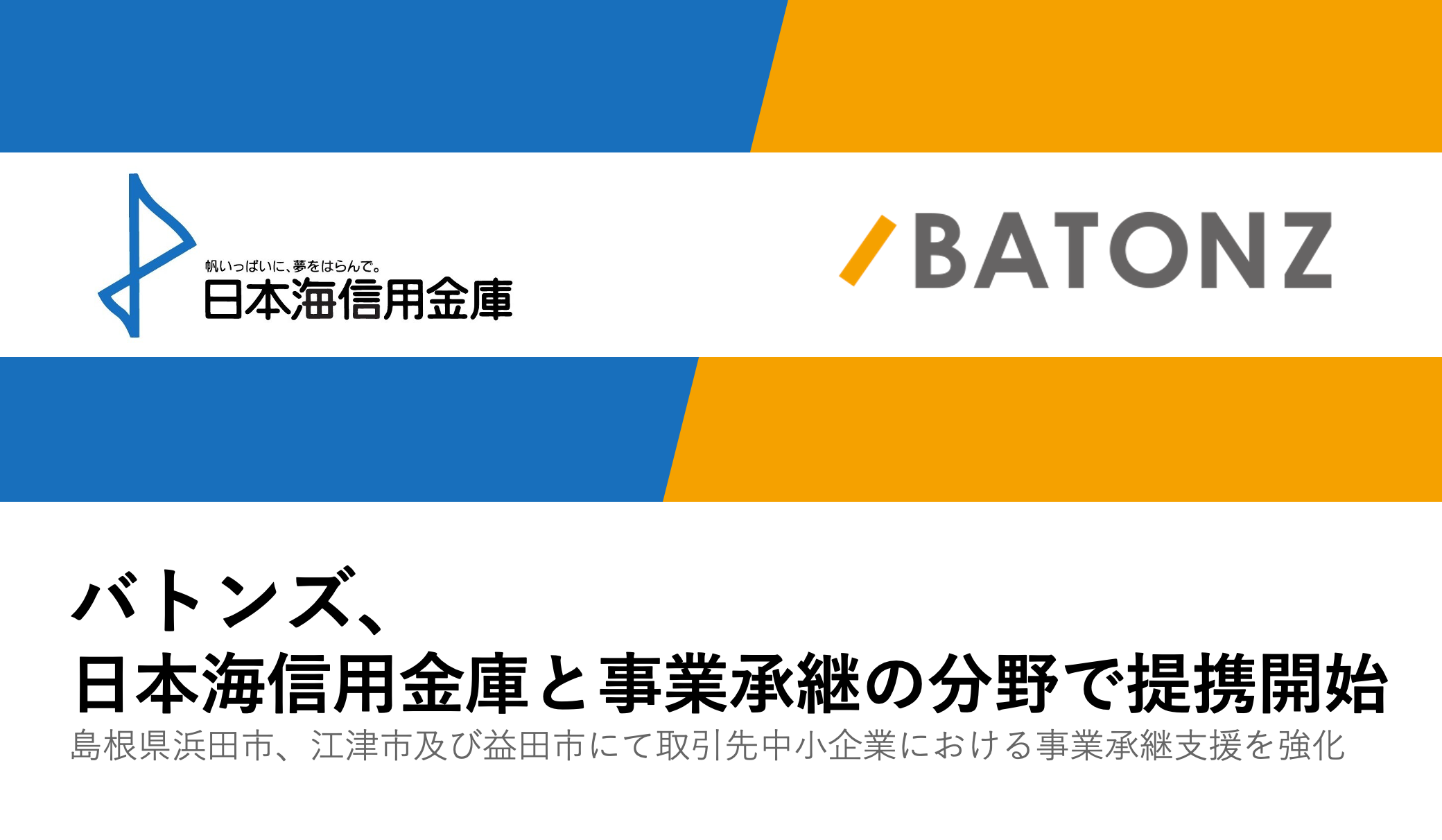 日本海信用金庫は、地域密着型金融への取り組みの中で、取引先企業のライフステージに応じた支援に力を入れており、平成24年11月に中小企業経営力強化法における認定経営革新等支援機関としても認定されています。事業承継への取り組みとしては、後継者育成塾の継続実施や専門機関を招いた研修会等による職員の支援能力の向上を図ってきました。今後はバトンズと提携することで、後継者のいない中小企業・小規模事業者の第三者承継・M&Aをより推進し、事業承継支援ネットワークを強化します。これにより、後継者不在企業の事業承継を推進して価値ある事業を次世代へとつなげることで、地域再生、ひいては地域活性化を図ることを目的としています。