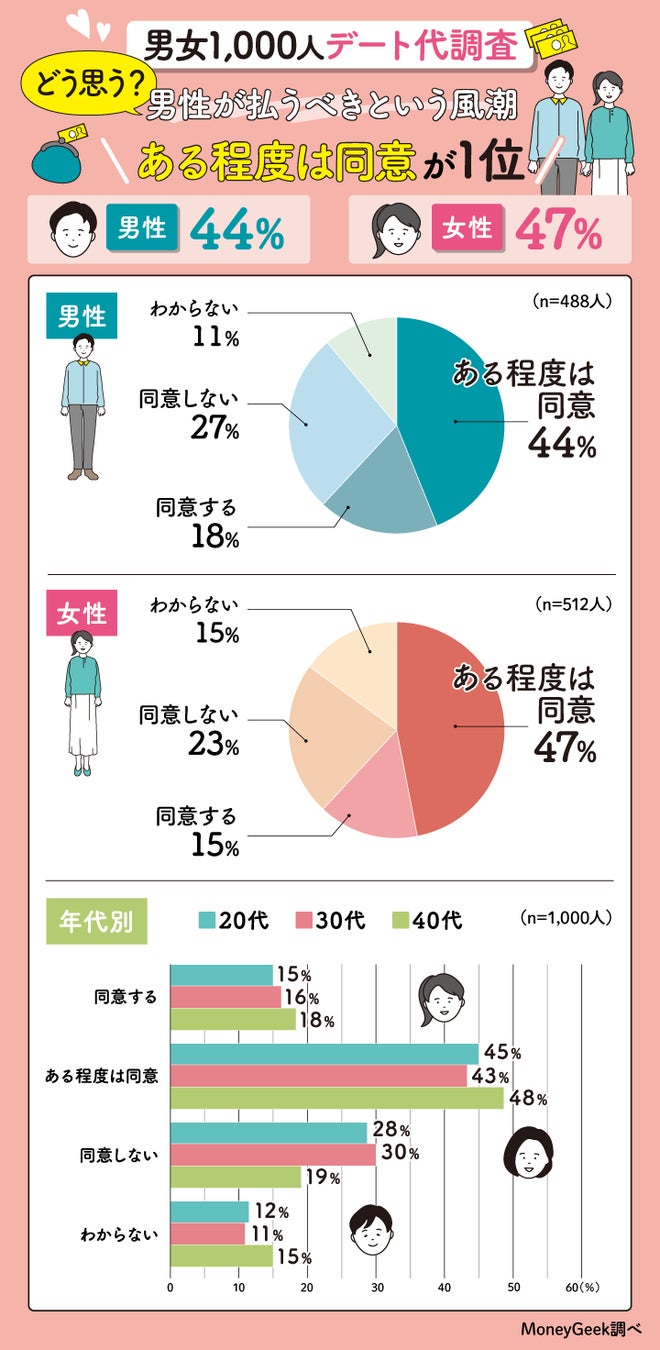 冒頭の意識調査で、「デート代は男性が支払うべき」という風潮に対して、「同意する」もしくは「ある程度は同意する」と回答したのは、男女ともに62%でした。