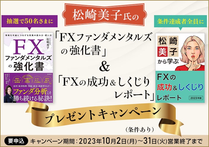 ロンドンを拠点に個人トレーダーとして活躍し、当社ウェブサイトにコラムを執筆している松崎美子氏の新刊書籍「FXファンダメンタルズの強化書」を、本キャンペーンに申し込み、期間中に対象通貨ペアで合計5万通貨以上の新規取引をされた方の中から、抽選で50名さまにプレゼントします。