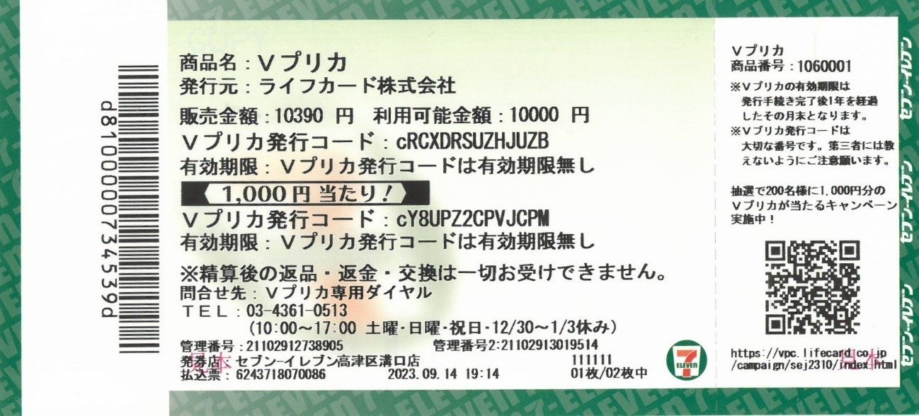 Vプリカ購入後、レジで受け取るチケットに【1,000円当たり!】の記載があれば当たりです。