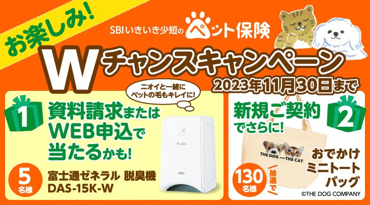 SBIいきいき少額短期保険株式会社(本社:東京都港区、代表取締役社長:採田 祐治、以下「当社」)は、ペット保険の資料請求またはWEB申込をされた方、新規ご契約いただいた方、それぞれを対象としたプレゼントキャンペーンを実施しています。