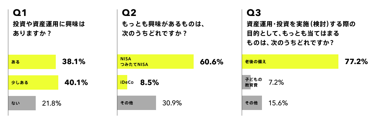 生活物価の上昇のニュースや、2024年に始まる新しいNISA制度等、将来に向けた個人の資産形成・運用ニーズはますます高まっています。パーソルテンプスタッフが、テンプスタッフ支店の預金口座で給与をお受け取りの派遣スタッフ等を対象に実施したアンケート調査(※1)でも、同様に高いニーズがあることが分かりました。「投資や資産運用に興味はありますか?」という質問にたいして”ある”と回答した方が78.2%(※2)、特に、老後の備えを目的に税制優遇が受けられる「NISA」「iDeCo」での長期投資に関するニーズが高い傾向が見られました。