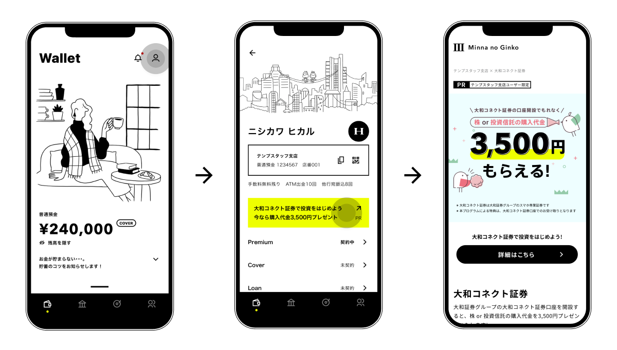① みんなの銀行アプリの「マイページ」を経由して大和コネクト証券の証券口座を開設することで、大和コネクト証券が提供する資産運用サービスをご利用いただけます。 ② ①の流れでお申込みいただくことで、みんなの銀行テンプスタッフ支店をご利用のお客さまを対象とした特別な優遇プログラムやキャンペーン等の特典が受けられます(※1)。 ※1 みんなの銀行アプリの「マイページ」を経由せずに大和コネクト証券の証券口座を開設した場合、②の特典は対象外となります。 |