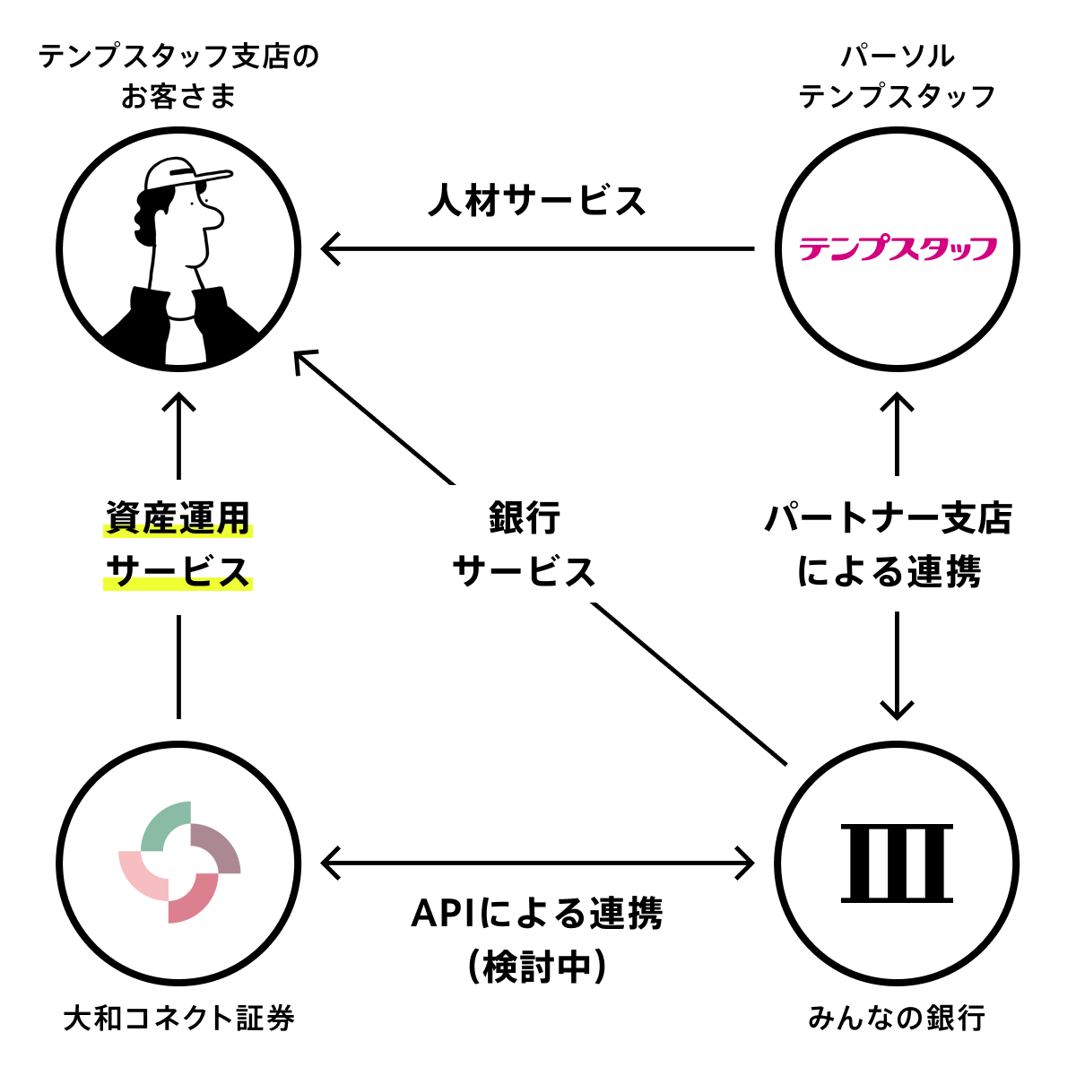 大和コネクト証券株式会社(代表取締役社長 大槻 竜児、以下「大和コネクト証券」)は、本日より、株式会社みんなの銀行(取締役頭取 永吉 健一、以下「みんなの銀行」)とパーソルテンプスタッフ株式会社(代表取締役社長 木村 和成、以下「パーソルテンプスタッフ」)との「みんなの銀行テンプスタッフ支店」におけるサポートメニューである「はたらくサポートプログラム」拡充の一環として、オンラインでの資産運用サービスの連携を開始します。