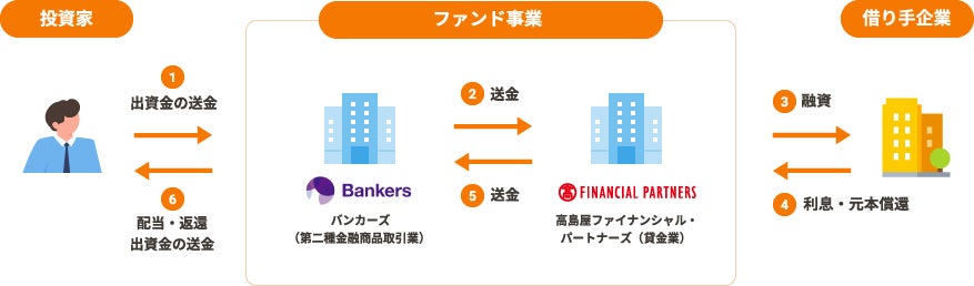 TFPが投資案件開拓・貸付審査・貸付を行い、バンカーズがファンド審査・投資家の募集・管理を担います。お客様(投資家)は、バンカーズが運営する専用ウェブサイトより投資口座を開設することで、ご希望の案件へ投資することが可能となります。なお、既にバンカーズに投資口座をお持ちのお客様(投資家)は新たに投資口座を開設していただく必要はありません。