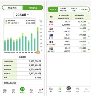資産の推移はグラフで表示、通貨ごとの運用状況もひと目で把握ができます。