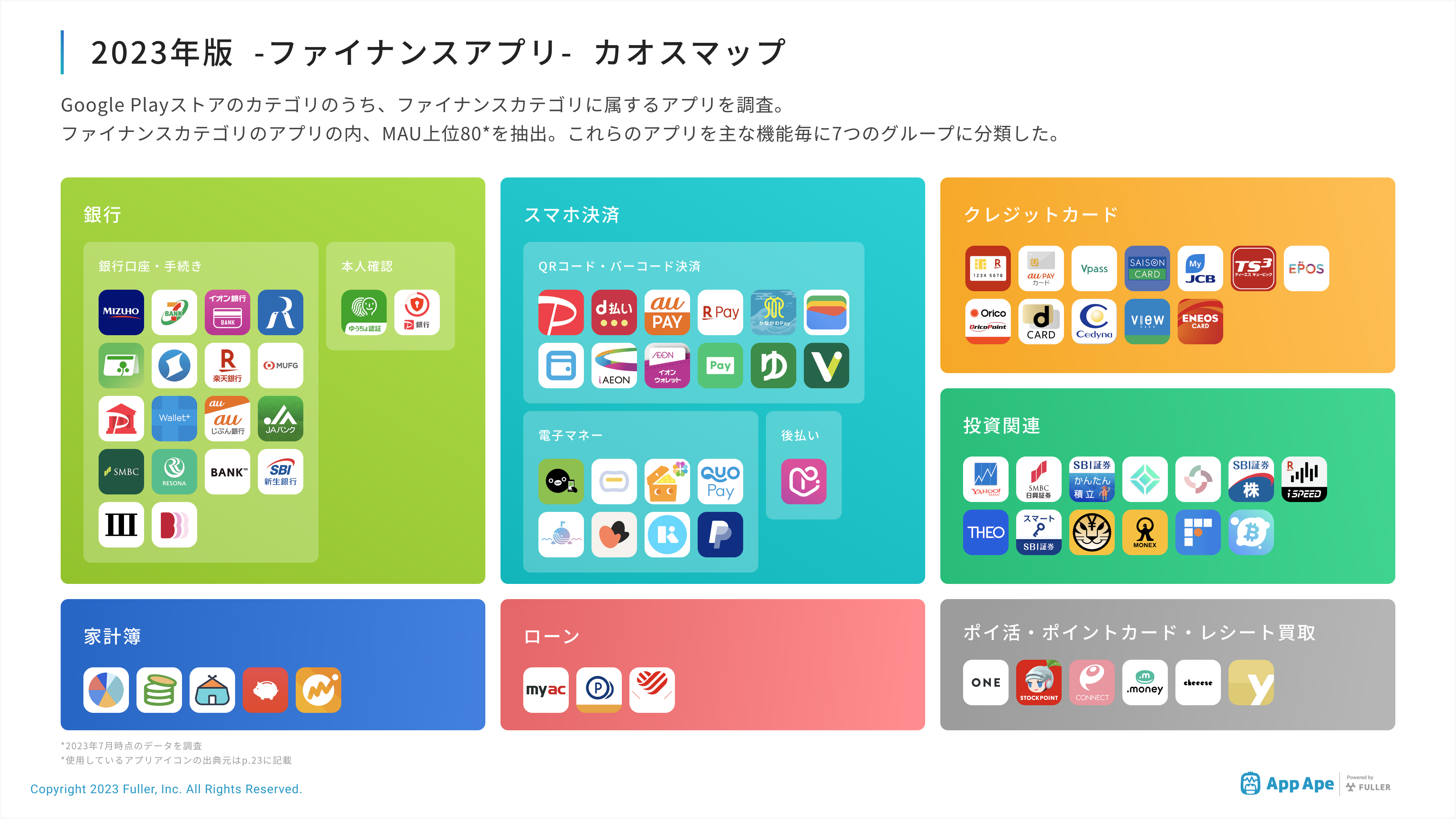 Google Playストアのファイナンスカテゴリに属するアプリのうち、MAU上位80のアプリを抽出。アプリの主な機能毎にグループ分けをしカオスマップを作成しました。