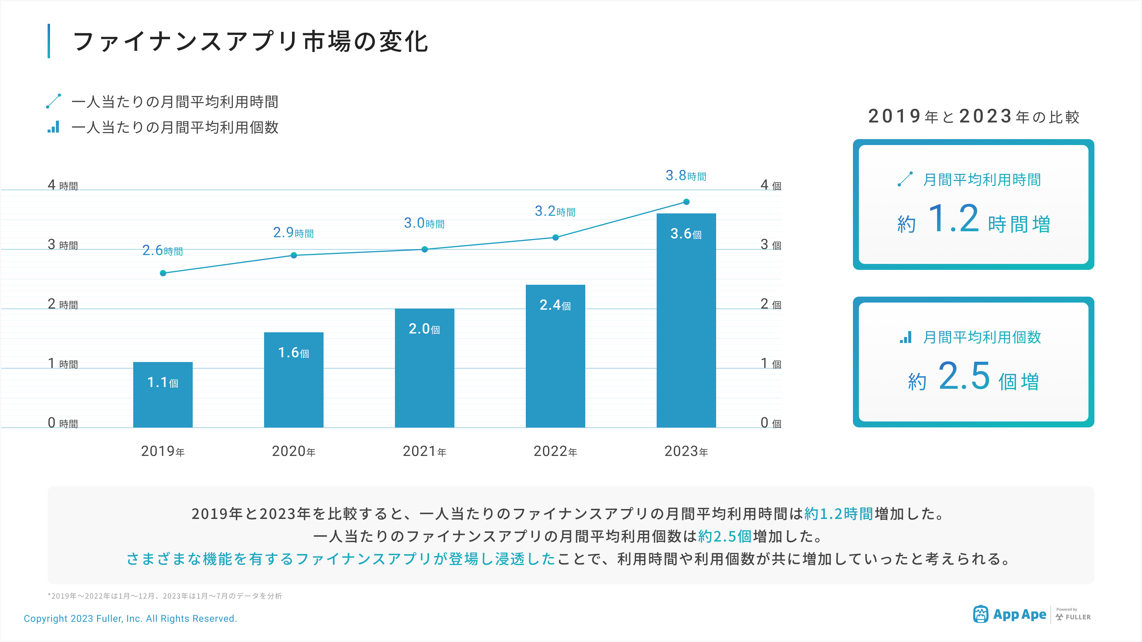 2023年の一人当たりのファイナンスアプリの月間平均利用時間は3.8時間と2019年に比べ約1.2時間増加しました。