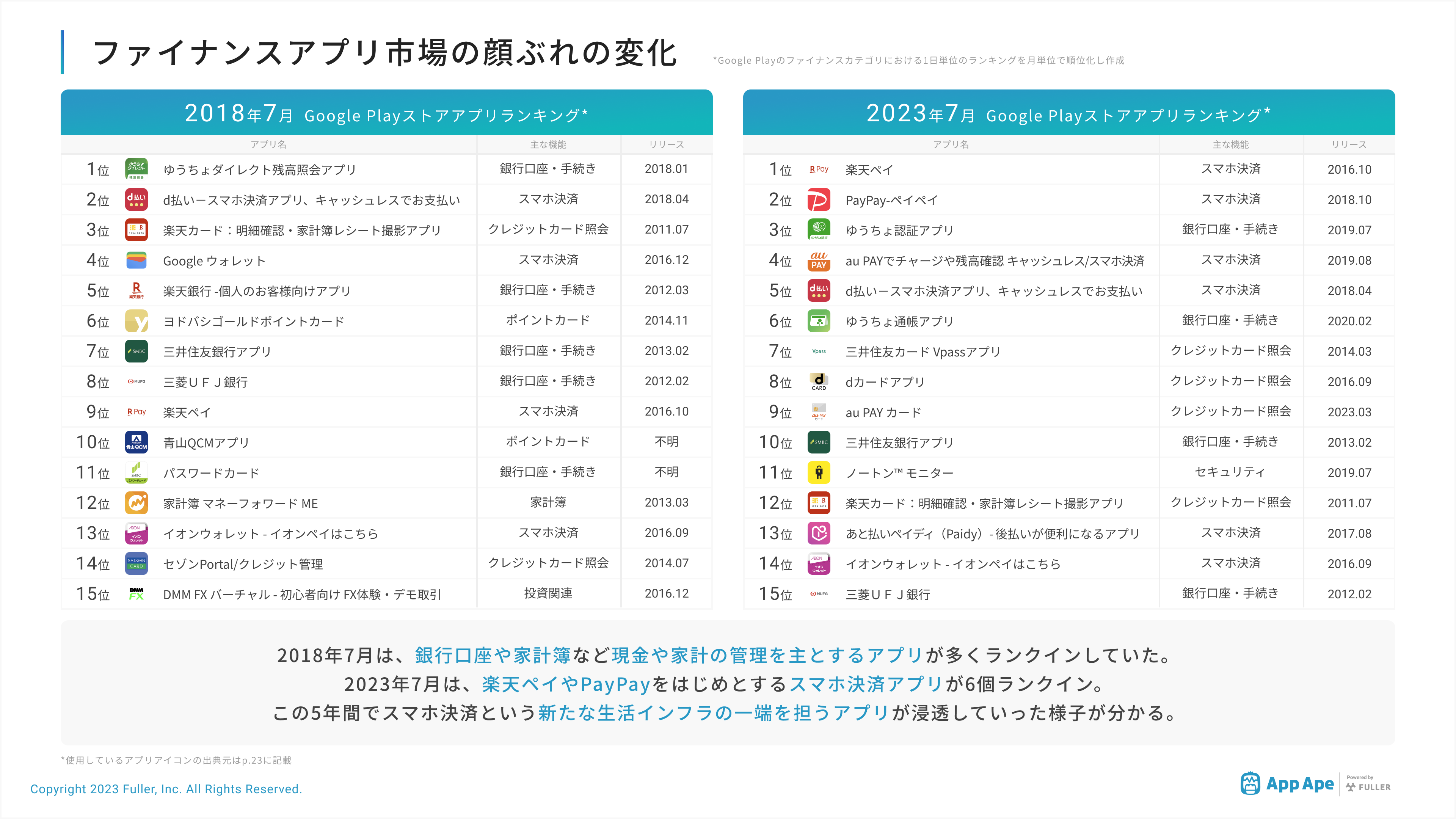 この5年間で、スマホ決済という新たな生活インフラの一端を担うアプリが浸透していった様子がランキングの顔ぶれからも伺えます。
