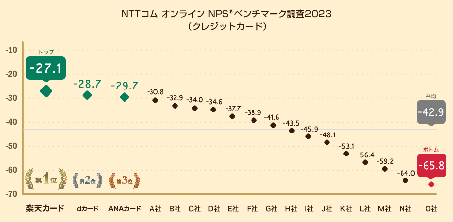 対象のクレジットカード会社18社のうち、NPSのトップは楽天カード(-27.1ポイント)、2位はdカード(-28.7ポイント)、3位はANAカード(-29.7ポイント)となりました。対象18社のNPS平均は-42.9ポイント、またトップ企業とボトム企業との差は38.7ポイントとなりました。