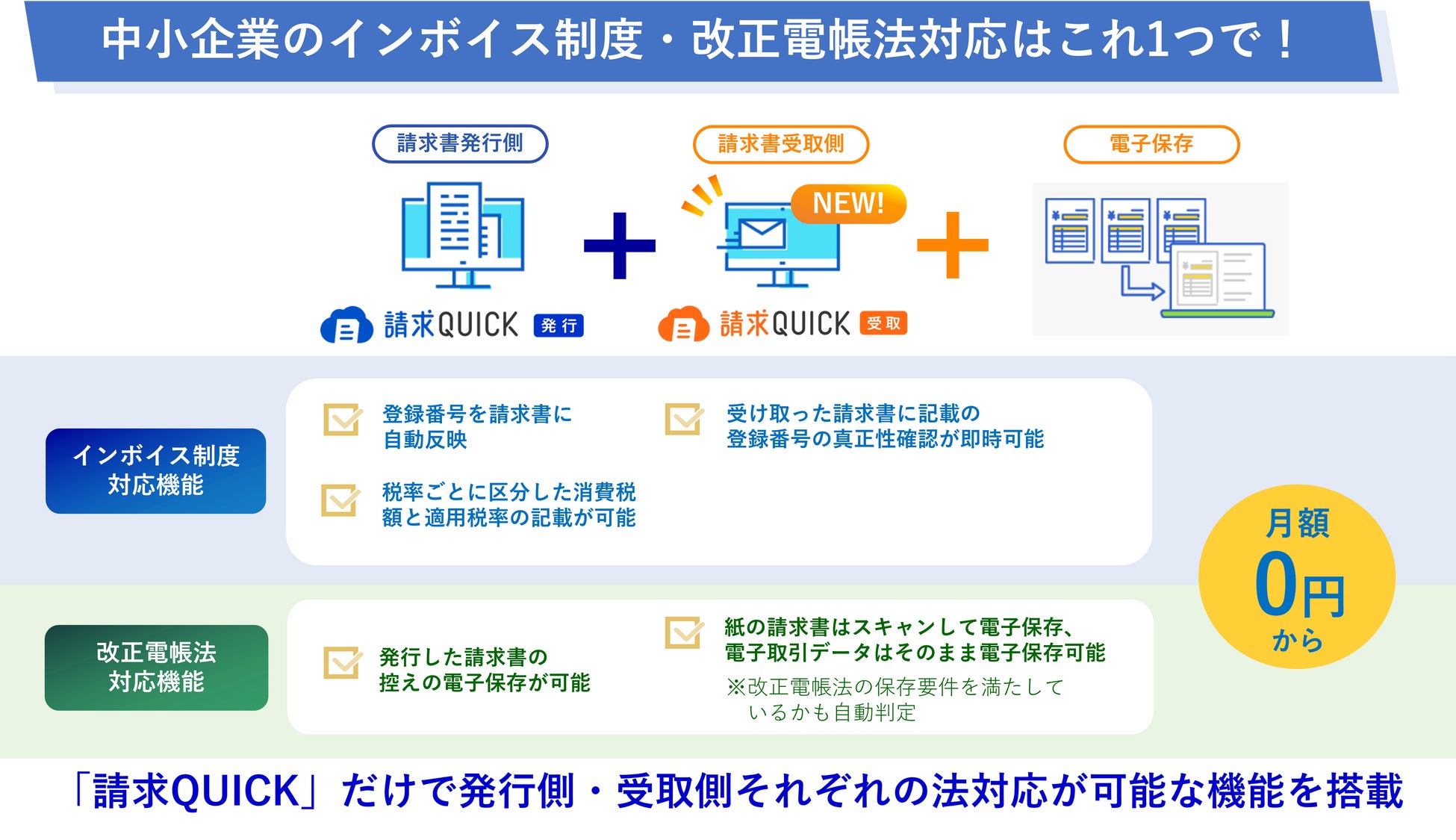 これにより、インボイス制度対応・改正電帳法対応にかかる請求書の発行機能・受取機能・電子保存を、1つのシステムで月額無料からご利用いただけます。