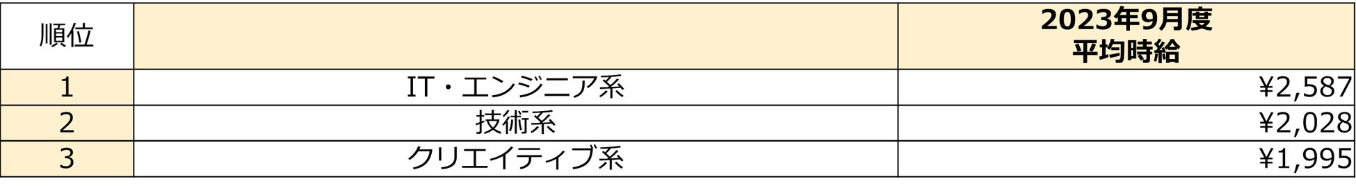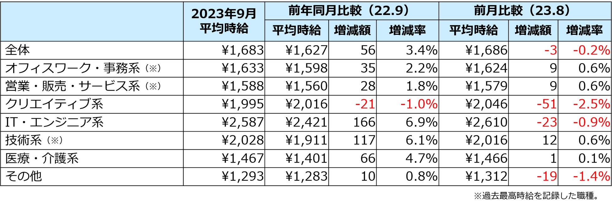 9月度の三大都市圏 職種別平均時給は、オフィスワーク系、販売・サービス系、技術系で過去最高を更新。