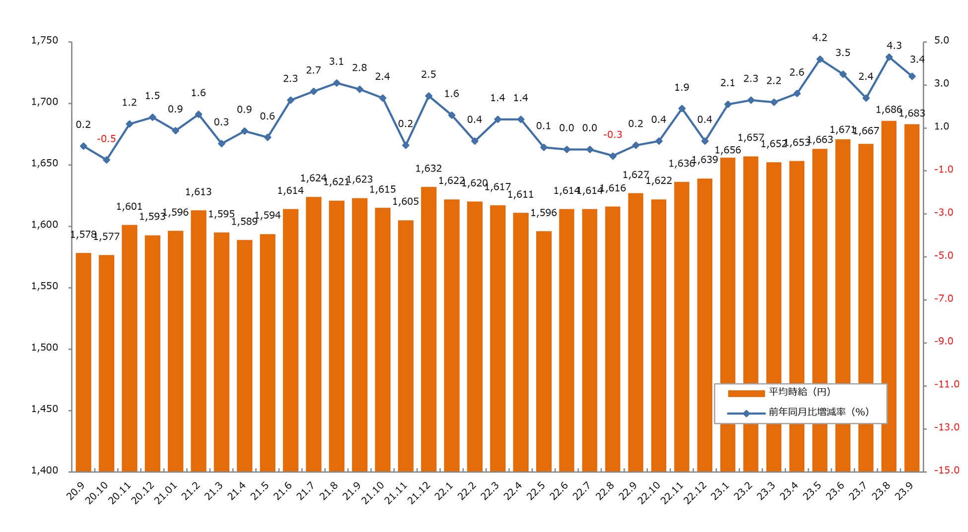 9月度の三大都市圏平均時給は1,683円。前年同月比+56円の大幅な上昇。