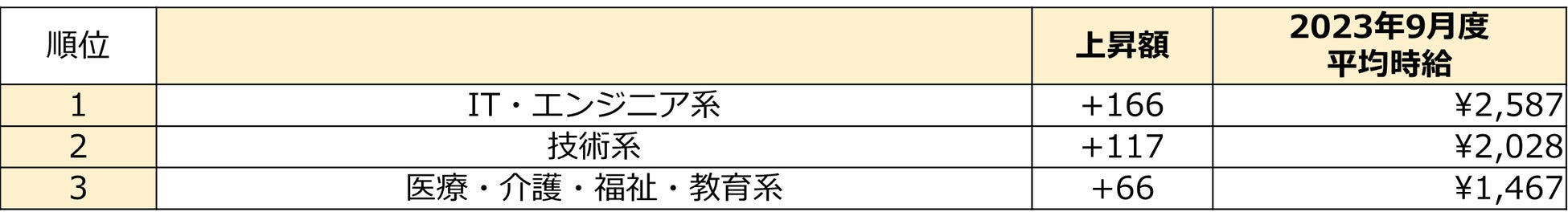 9月度の職種別/前年同月比 時給上昇額ランキング