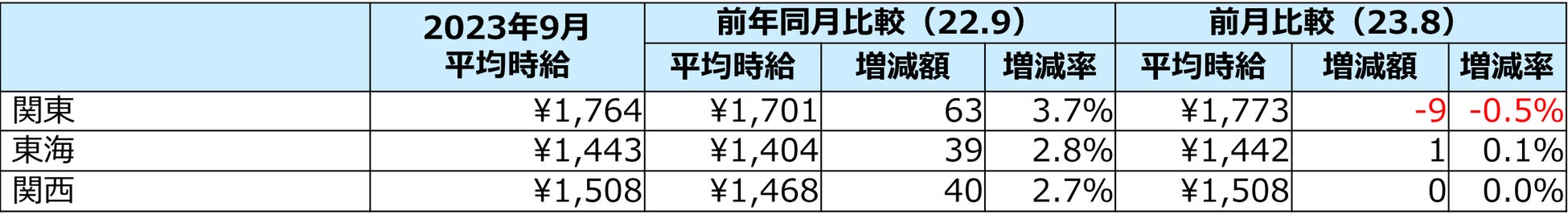9月度のエリア別平均時給は、全エリアで前年同月比プラスを記録。