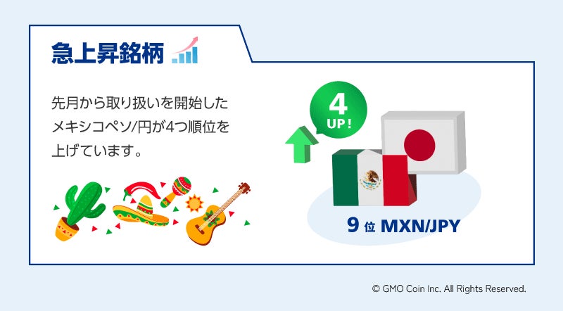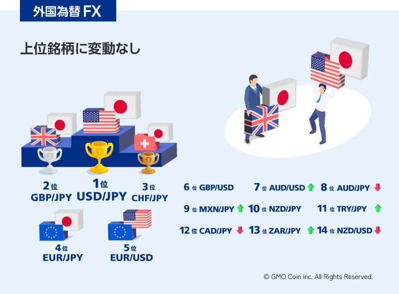 「外国為替FX」では、上位銘柄に変動はなく、USD/JPY(米ドル/円)が引き続き1位となりました。また8月から取り扱いを開始したMXN/JPY(メキシコペソ/円)が4つ順位を上げました。
