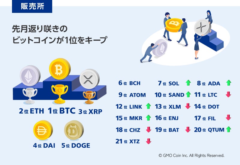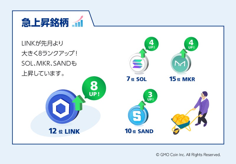「販売所」では、先月1位に返り咲いたビットコイン(BTC)が引き続き1位となりました。前月のランキングと比較すると、チェーンリンク(LINK)が大きく8つ順位を上げ、ソラナ(SOL)、メイカー(MKR)、ザ・サンドボックス(SAND)も3つ以上順位を上げました。