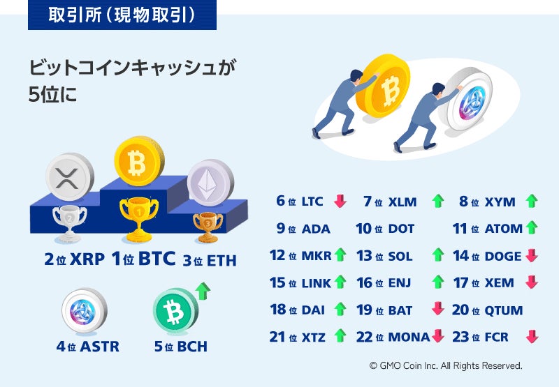 「取引所(現物取引)」では、「販売所」と同様にビットコイン(BTC)が1位をキープしました。先月のランキングと比較すると、ビットコインキャッシュ(BCH)が順位を1つ上げて5位にランクインしました。