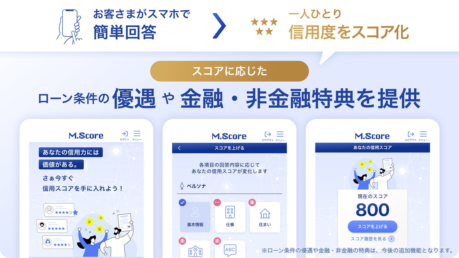 「M.Score」は、金融機関が自らスコアモデルを保有せず、SaaS利用料だけで信用スコアサービスの導入ができ、このサービスを導入することで、金融機関は初期投資を抑えながら短期間かつ簡単に信用スコアを活用したスコアカードローンなどの新サービス提供が可能となります。
