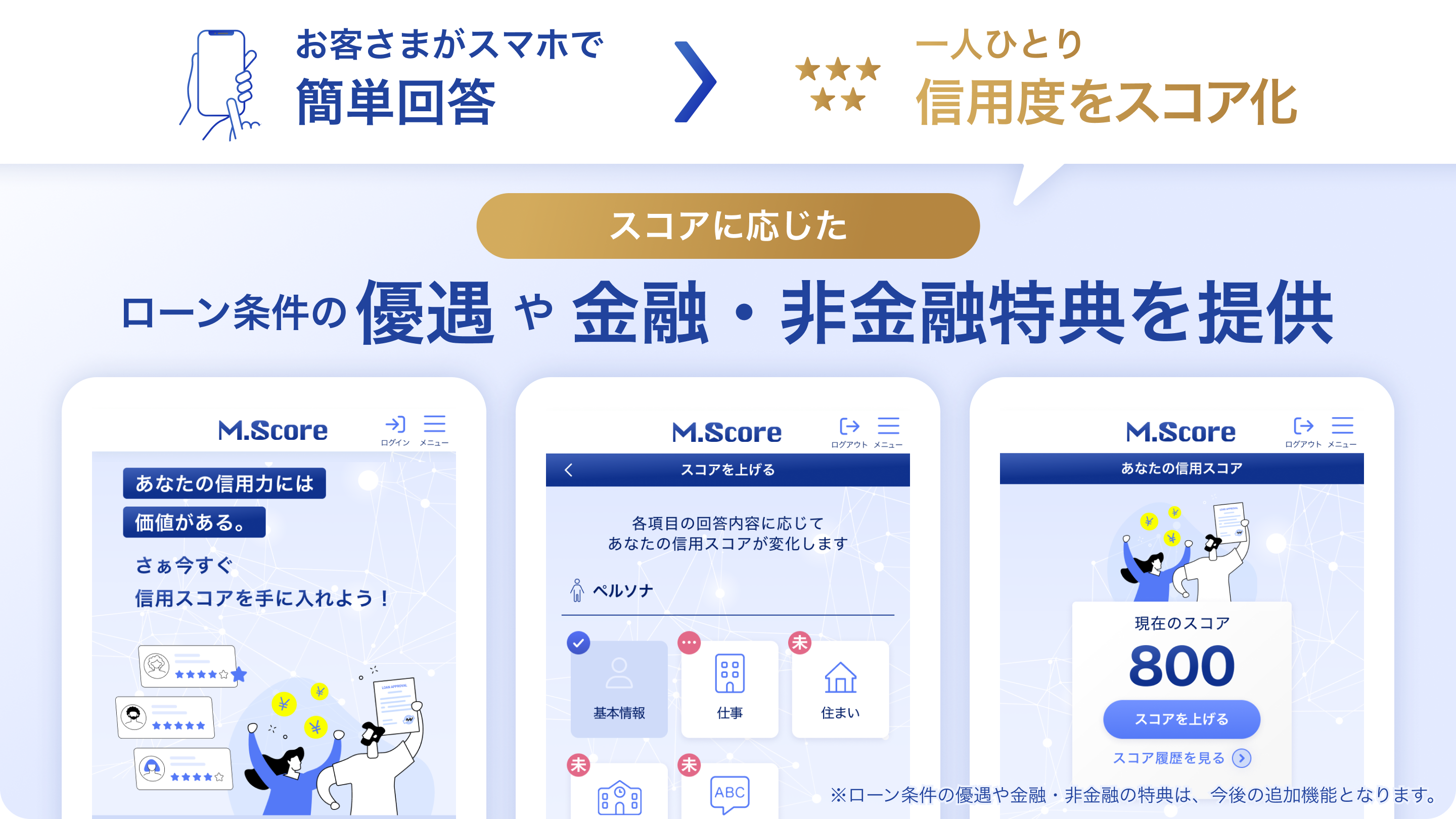 「信用スコア」とは、個人のお客さまがスマホで質問に回答すると、一人ひとりの信用度がスコアとして見える化され、スコアに応じてローンの条件が優遇されるほか、様々なレコメンドや金融・非金融の優遇特典が受けられるサービスです。