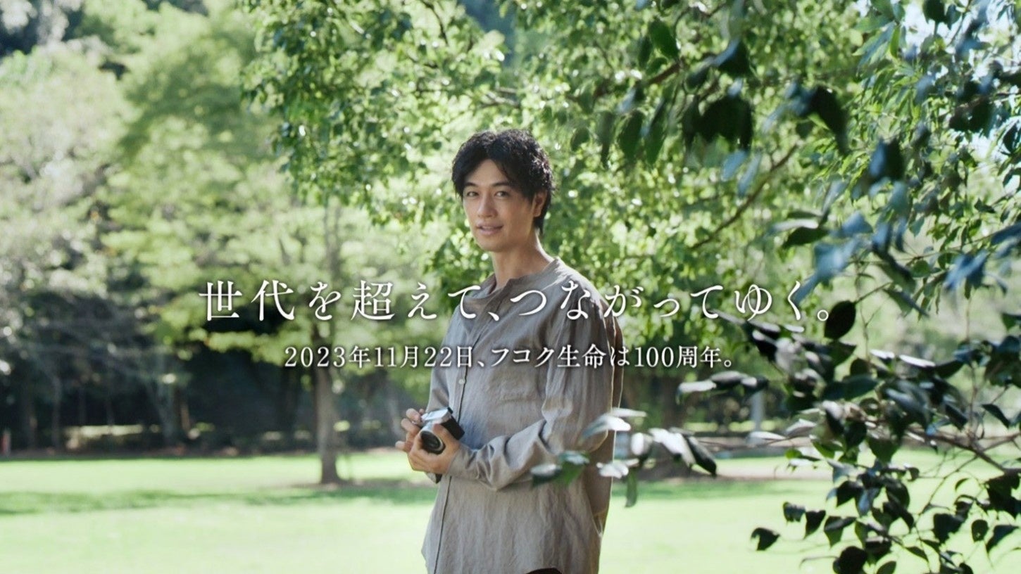 『三世代家族篇』では、美しい木々を背景に斎藤工さんが優しいまなざしで、フコク生命のアドバイザーと、三世代の家族がテーブルを囲み、美味しそうにお祝いの食事をし、戯れ合い、家族写真の輪に加わる様子を、ファインダーを通し見つめています。アドバイザーがお客さまに寄り添う“人と人の間に”というメッセージを強く込めています。