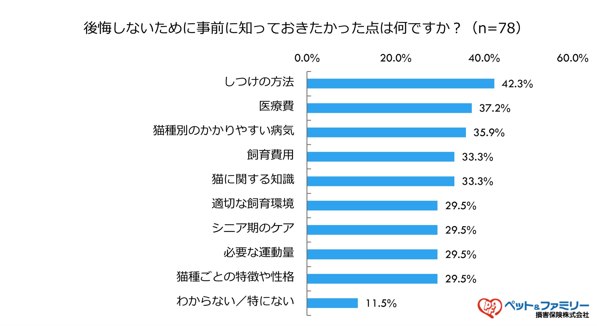 多かれ少なかれ後悔したと感じたことのある78名の飼い主さんに「猫を飼う前に事前に知っておきたかったこと」を聞いたところ上記の結果となりました。