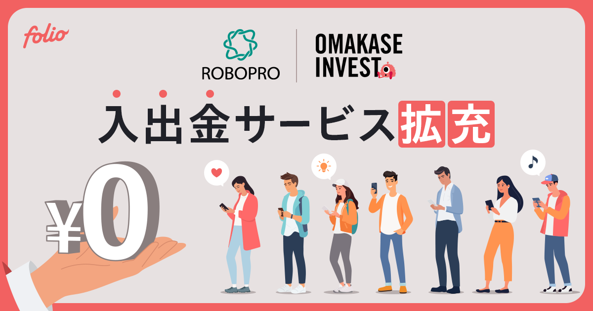 これまで、出金手数料として、1回あたり300円(税込)をお客さまにご負担いただいておりましたが、10月21日(土)11時以降の出金申込分より、無料といたしました。これにより、ROBOPRO、おまかせ投資については、年率1.1%(税込)の手数料以外で各種取引ごとにかかる費用はすべて無料となります。