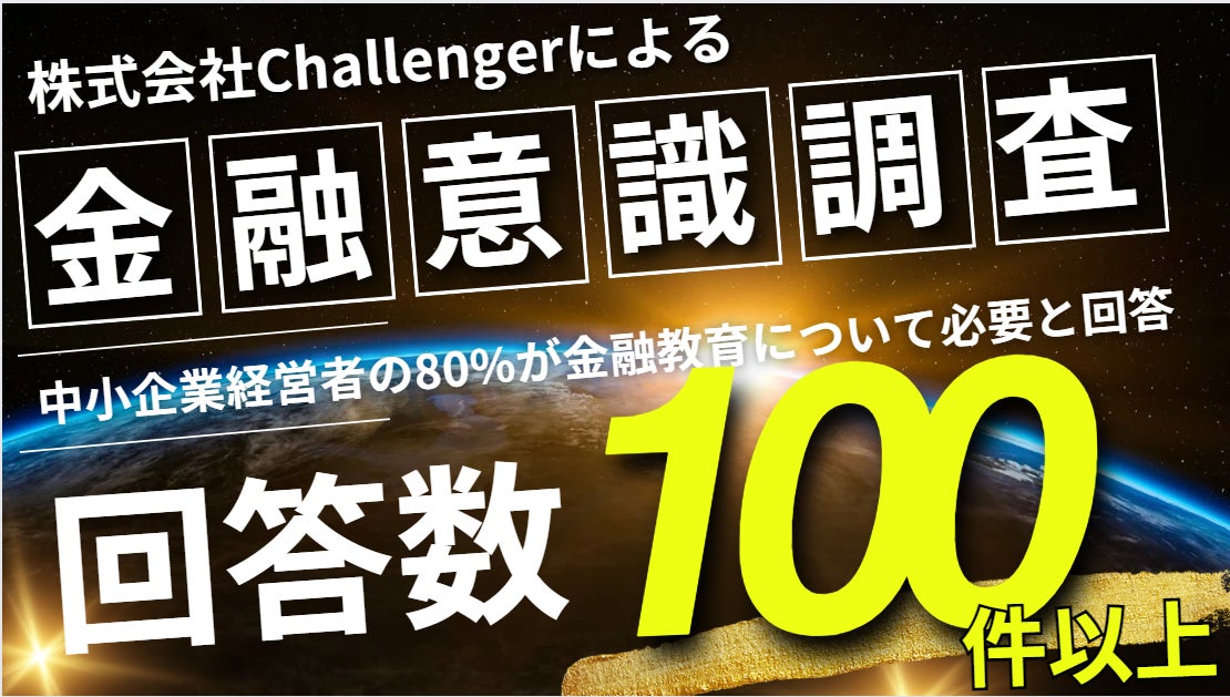 金融教育サービスを手掛ける株式会社Challenger(本社:愛知県名古屋市、代表取締役:鳥海翔)が、名古屋の中小企業経営者100人に金融意識調査を実施いたしました。調査結果によると80%の中小企業経営者が「社員の金融教育が必要」と回答しました。学校教育において金融教育が義務化された一方、企業でも金融教育の必要性が高まっていることが明らかになりました。