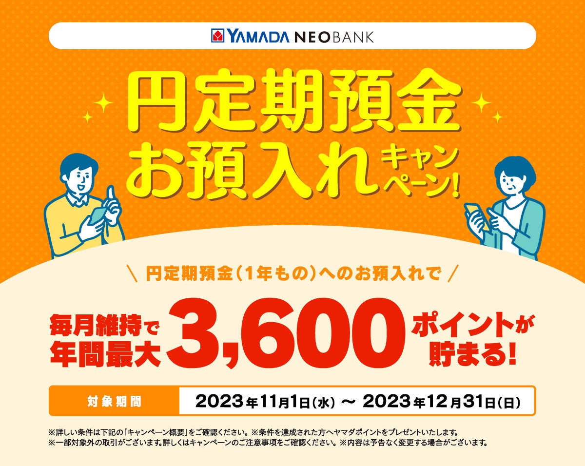 株式会社ヤマダホールディングスのグループ企業である株式会社ヤマダデンキ(本社:群馬県高崎市、代表取締役社長:上野 善紀、以下、ヤマダデンキ)は、提供している銀行サービス「ヤマダNEOBANK」において、2023年11月1日(水)より「円定期預金(1年もの)お預入れキャンペーン」を開催いたします。