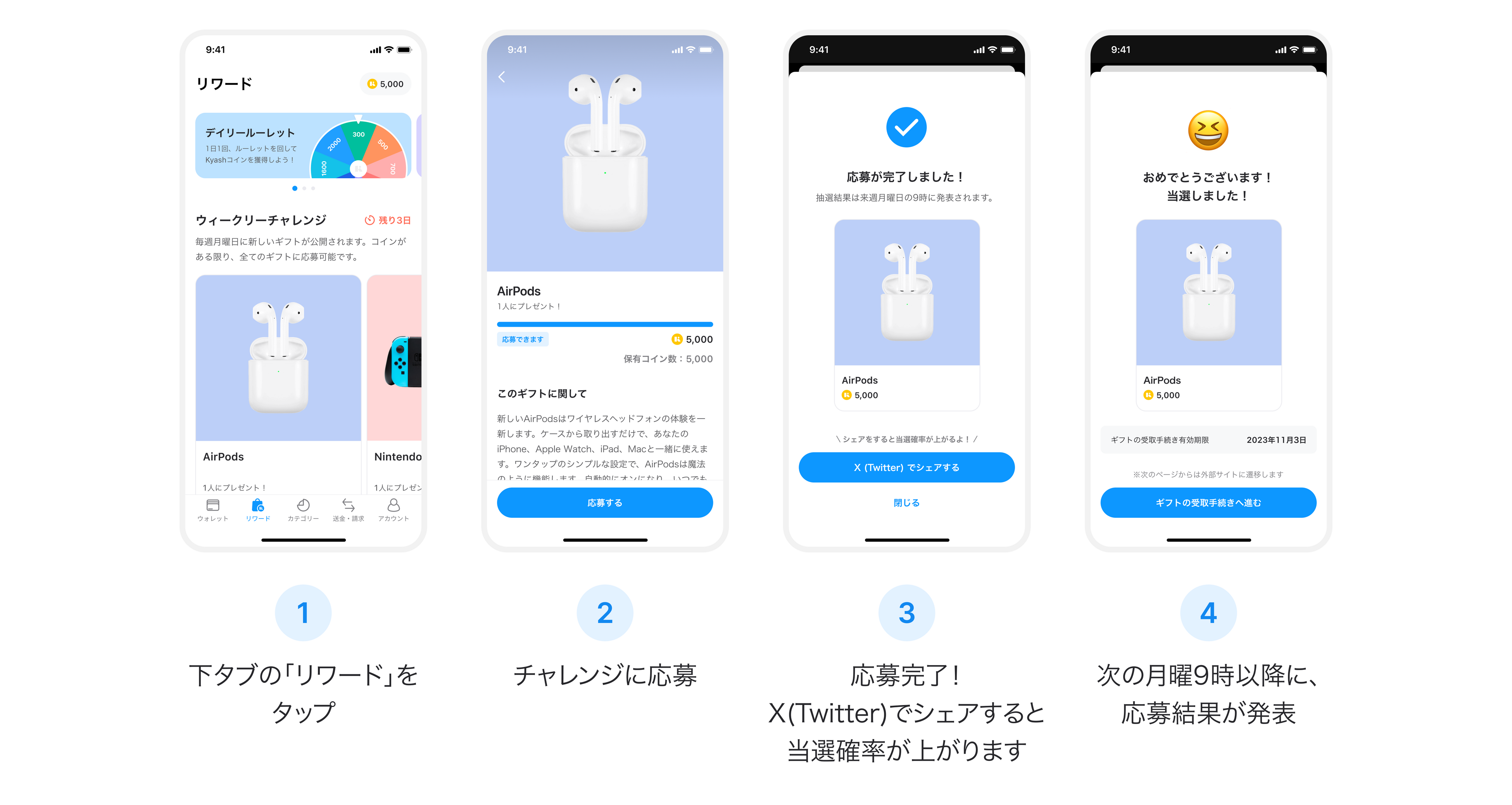 これまでKyashで決済した金額の最大1%をポイントとして還元していましたが、加えて今後はKyashコインも貯まるようになり、抽選で人気賞品が当たるチャレンジがお楽しみいただけます。