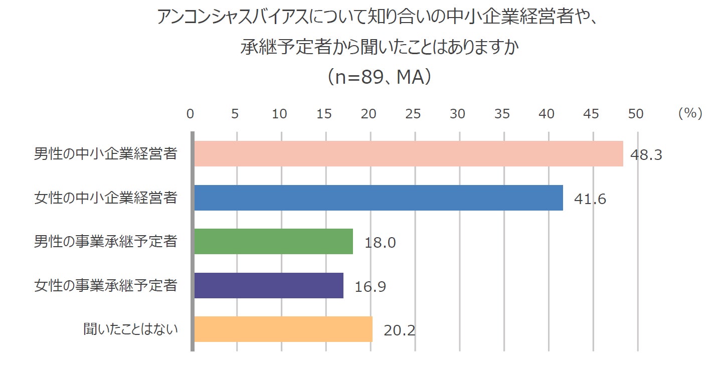 また、アンコンシャスバイアスについて「言葉やその概要を説明できるくらい知っている」「言葉やその概要について聞いたことはある」と回答した151名のうち、ご自身に対するアンコンシャスバイアスに基づく言動があったと回答した89名に、アンコンシャスバイアスについて知り合いの中小企業経営者や事業承継予定者から聞いたことがあるか聞いたところ、「男性の中小企業経営者」が48.3%、「女性の中小企業経営者」が41.6%、「男性の事業承継予定者」が18.0%、「女性の事業承継予定者」が16.9%となりました。また、「聞いたことはない」は20.2%となりました。