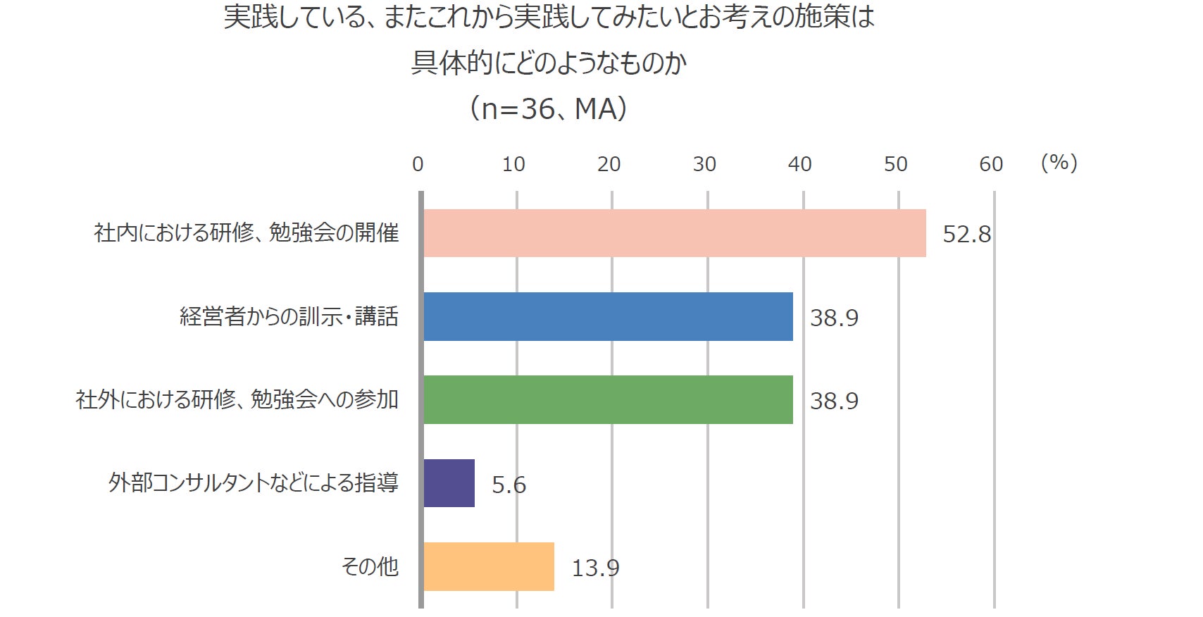 さらに「具体的な施策を考え実践している」、「現状は取り組んでおらず、これから考え実践してみたい」と回答した跡取り娘.com登録の中小企業経営者36名を対象に、取り組み内容を聞いたところ、「社内における研修、勉強会の開催」(52.8%)が最多となり、次いで「経営者からの訓示・講話」、「社外における研修、勉強会への参加」が同率(38.9%)となりました。
