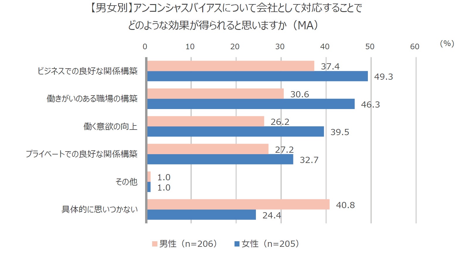 また男女別では、男性では最多が「具体的に思いつかない」(40.8%)となった一方、女性では「ビジネスでの良好な関係構築」(49.3%)が最多となりました。