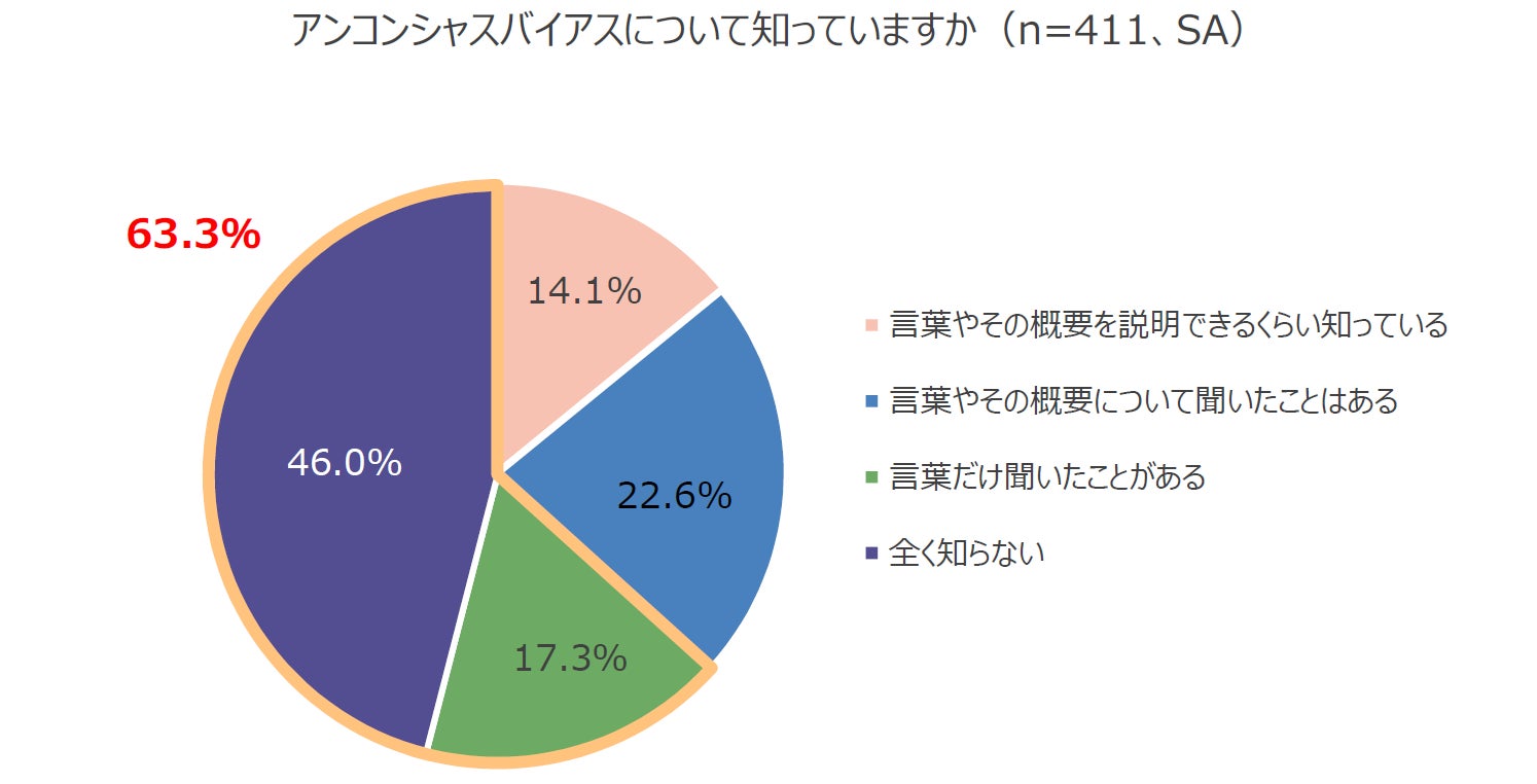1. アンコンシャスバイアスについて「全く知らない」が46.0%、「言葉だけ聞いたことがある」が17.3%と、あわせておよそ3分の2(63.3%)がよく知らない結果に