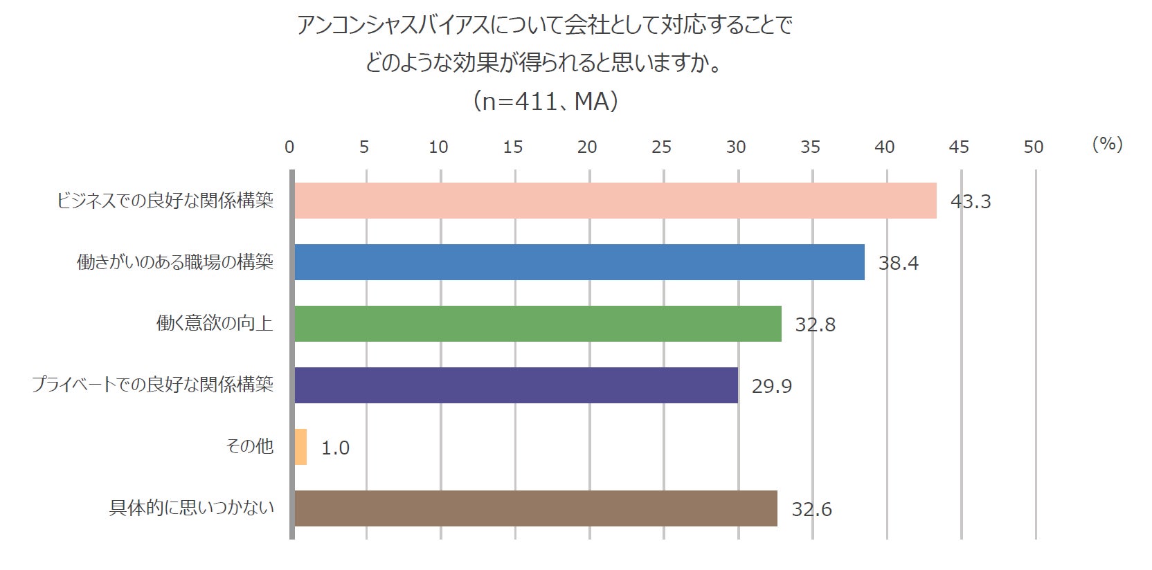 中小企業経営者と事業承継予定者411名に、アンコンシャスバイアスについて会社として対応することでご自身や周囲にとってどのような効果が得られると思うか聞いたところ、「ビジネスでの良好な関係構築」(43.3%)が最も多く、「働きがいのある職場の構築」(38.4%)、「働く意欲の向上」(32.8%)と続きました。