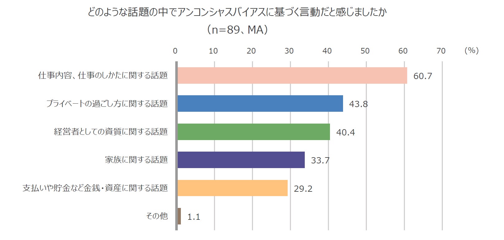 アンコンシャスバイアスについて「言葉やその概要を説明できるくらい知っている」「言葉やその概要について聞いたことはある」と回答した151名のうち、ご自身に対するアンコンシャスバイアスに基づく言動があったと回答した89名に、どのような話題の中で感じたのか聞いたところ、最多は「仕事内容、仕事のしかたに関する話題」(60.7%)、次いで「プライベートの過ごし方に関する話題」(43.8%)となりました。