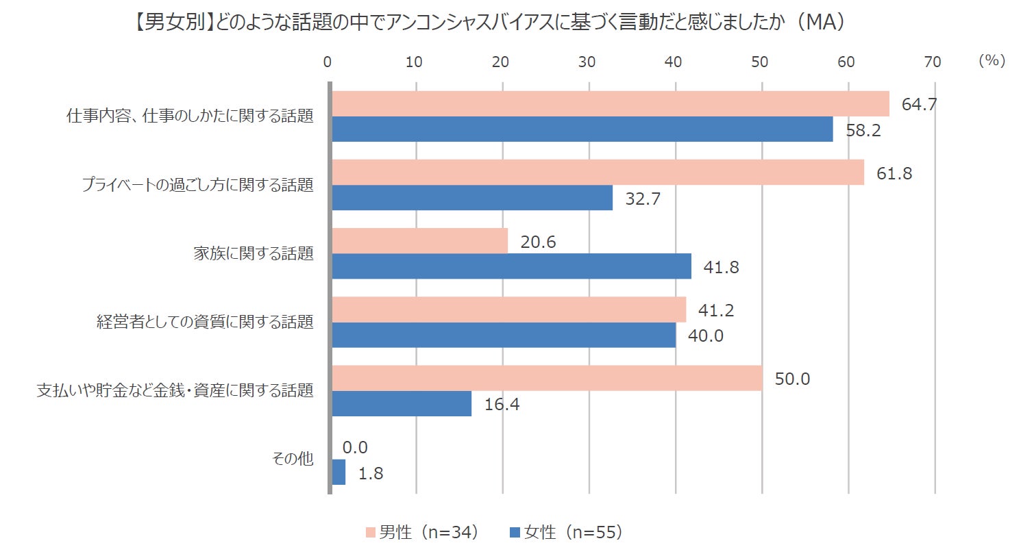 男女別に回答を見ていくと、男性では最多が「仕事内容、仕事のしかたに関する話題」(64.7%)、次いで「プライベートの過ごし方に関する話題」(61.8%)となりました。一方女性では、最多が「仕事内容、仕事のしかたに関する話題」(58.2%)、次いで「家族に関する話題」(41.8%)となりました。どちらも「仕事内容、仕事のしかたに関する話題」が最多となったものの、男女でアンコンシャスバイアスに基づく言動であると感じる話題に違いが見られました。