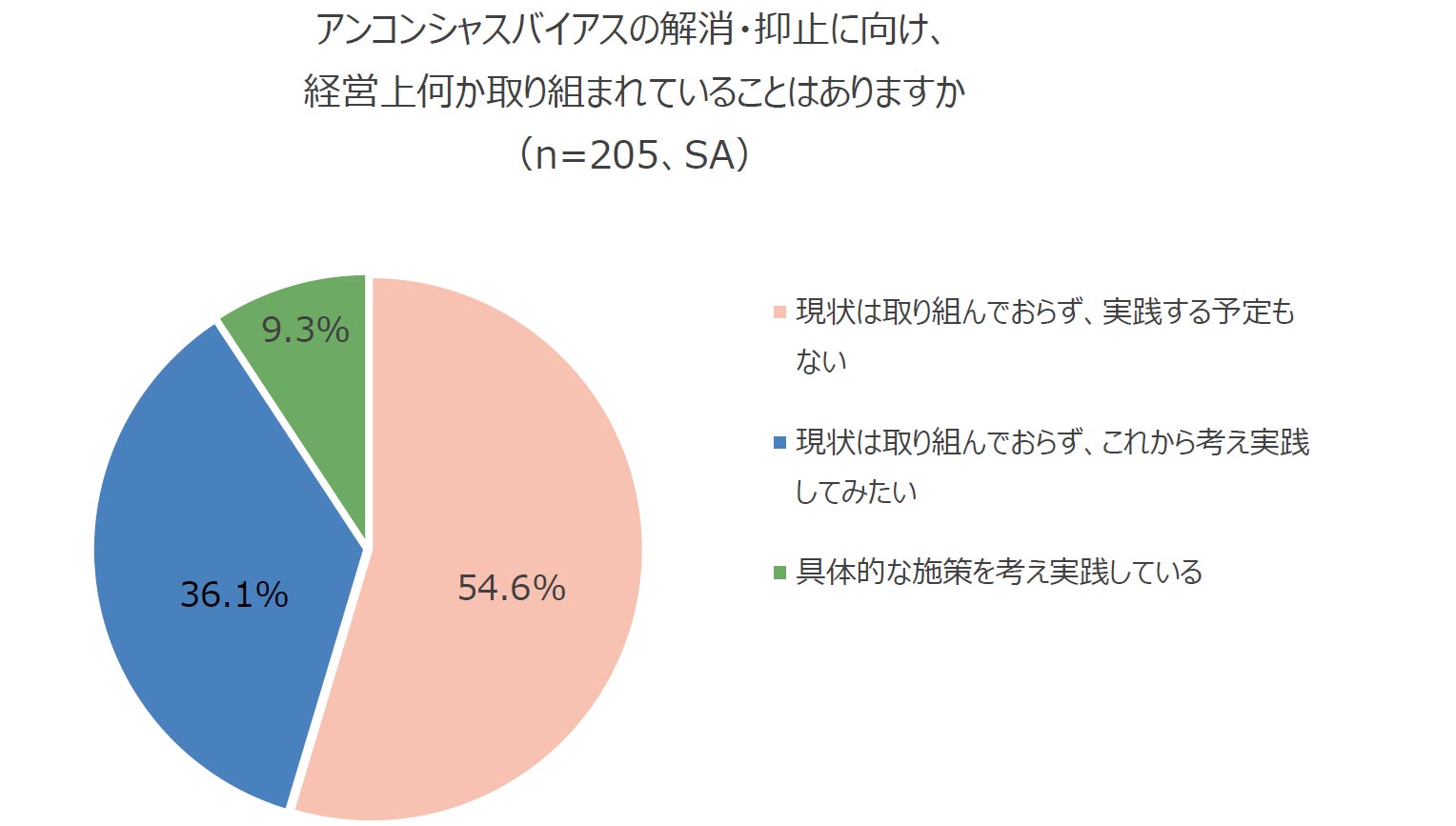 中小企業経営者205名を対象に、アンコンシャスバイアスの解消・抑止に向けて経営上何か取り組んでいることはあるか聞いたところ、「現状は取り組んでおらず、これから考え実践してみたい」が36.1%、「具体的な施策を考え実践している」が9.3%となりました。