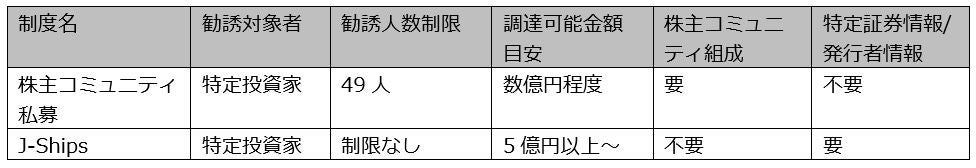 現在のFUNDINNO PLUS+は株主コミュニティ私募という仕組みで運営しております。今後株主コミュニティ私募とJ-SHIPSの制度を使い分けて、未上場企業の資金調達に貢献してまいります。制度の違いは以下の通りです。