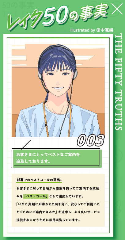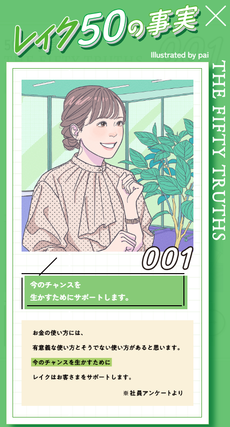 特設サイトでは、人生における色々な夢や目標に向かって毎日を励んでいるお客さまに、レイクの存在を思い出していただき、気軽に相談してほしいという想いを形にすべく、実際にレイクで働く社員の声を集めました。その社員の声を形にするために、『レイク50の事実』 と題して社員が日々の業務において大切にしているお客さまへのサポートを表現いたしました。また2名のイラストレーターにクリエイティブサポーターズとして参加いただいたことで、より分かりやすく・身近に『レイク50の事実』 を感じてもらえる内容になっています。