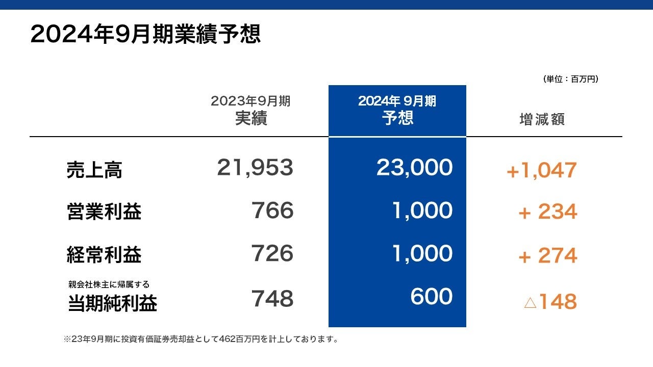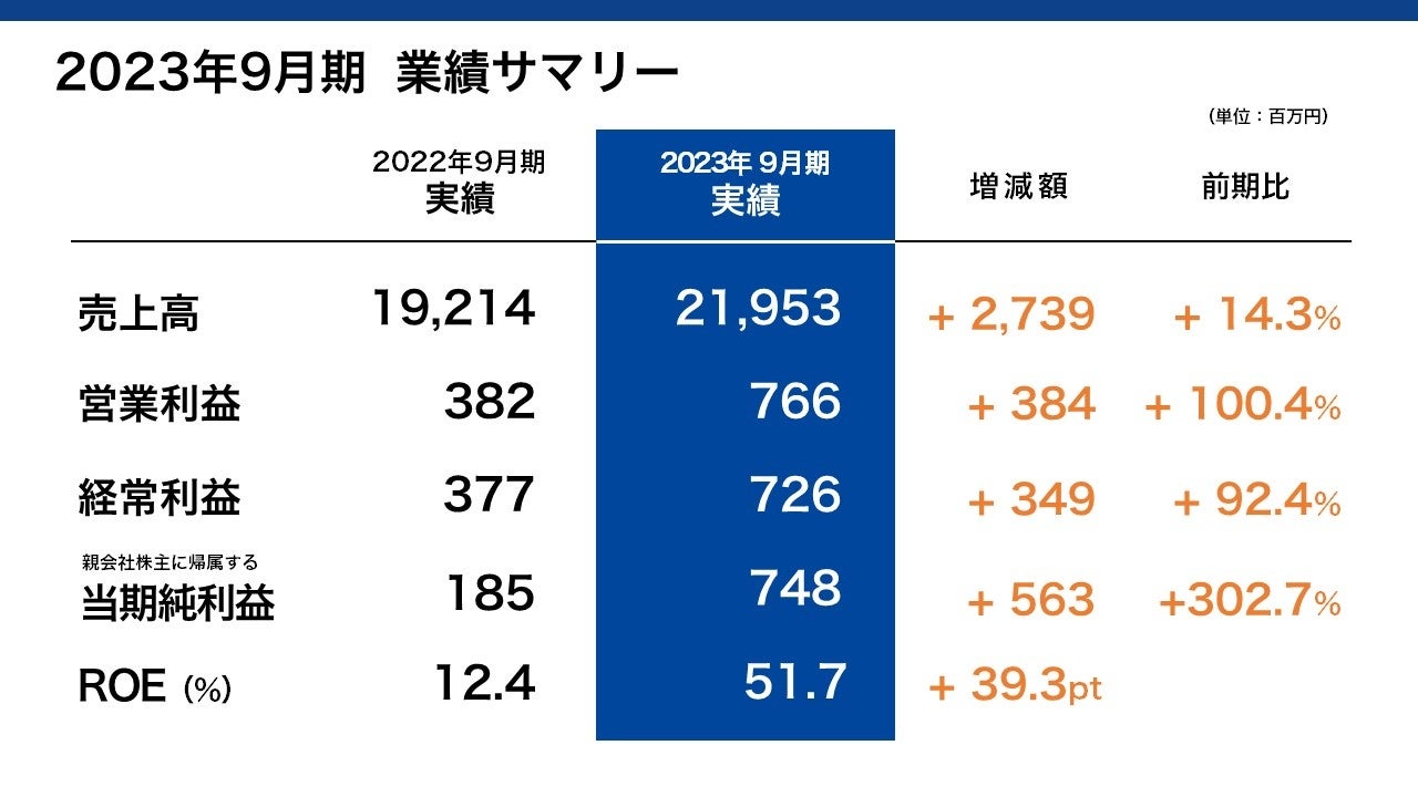 2023年9月期連結業績は、売上高21,953百万円(前期比+14.3%)、営業利益766百万円(前期比+100.4%)、経常利益726百万円(前期比+92.4%)、当期純利益748百万円(前期比+302.7%)となりました。