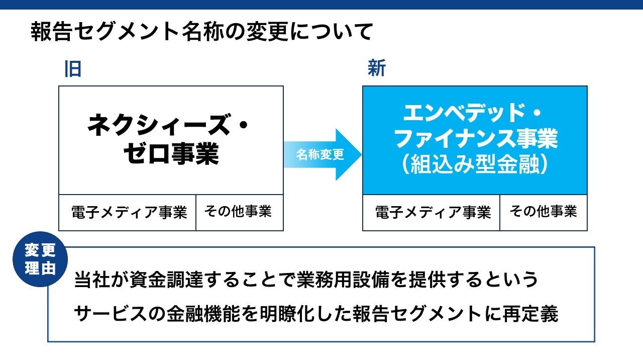 これまで「ネクシィーズ・ゼロ事業」として報告セグメントを区分しておりましたが、事業内容をより明確に表現することを目的として「エンベデッド・ファイナンス事業(組込み型金融)」に変更いたします。当社が資金調達し初期費用無料で業務用設備を提供することで顧客の資金調達(ファイナンス)を担う金融機能を強調した報告セグメントとして再定義いたしました。