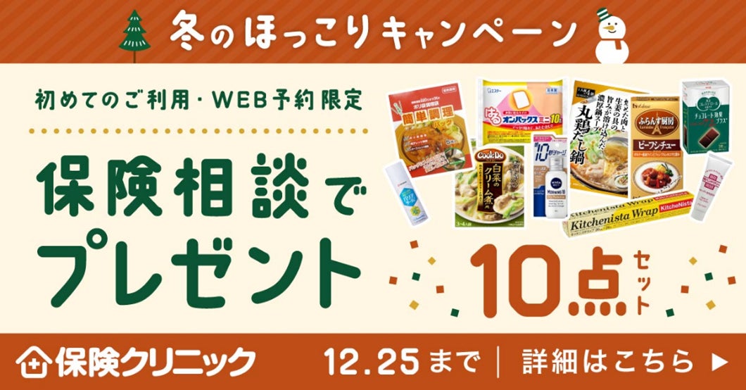 さらに温かく冬を過ごせるよう、ご予約の上ご来店いただいたお客様全員に「冬のほっこり10点セット」をプレゼントいたします。保険を見直して、温かく冬を乗り切りましょう。
