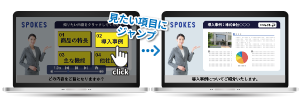 視聴者が見たいページをクリックして視聴できる「視聴者参加型のインタラクティブ動画」を作成できます。一方的に動画を見るのではなく、視聴者自らが知りたい情報を選択することが可能です。