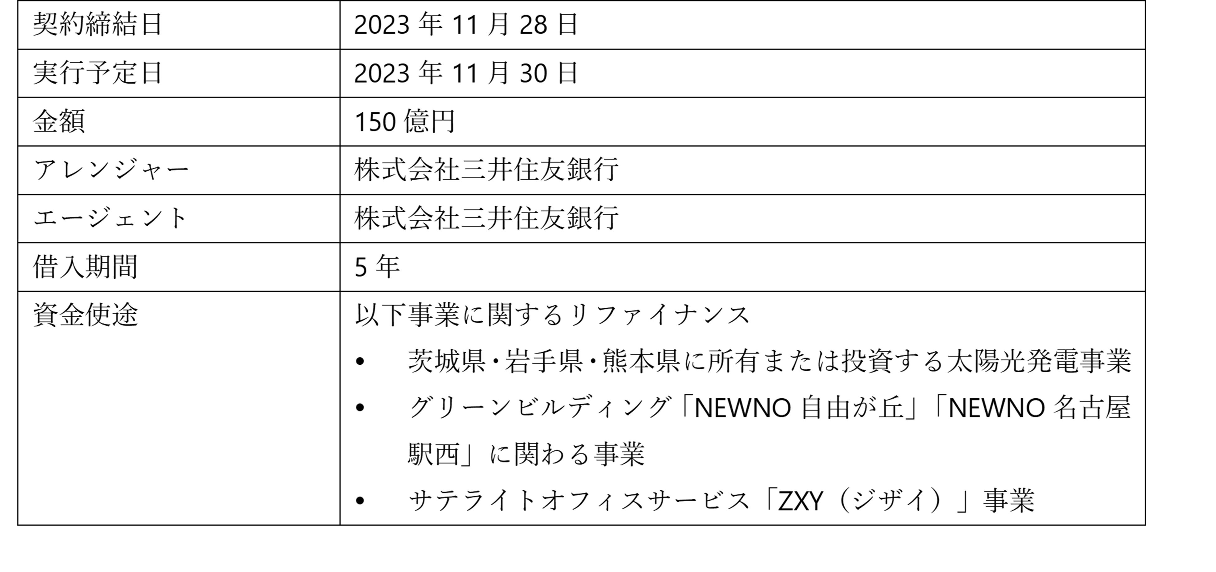 本ローン契約は、環境への貢献・社会課題の解決への取り組みに対する資金調達のためSMFLが策定したサステナブルファイナンスフレームワークに準拠し、「グリーン適格クライテリア」で定義した再生可能エネルギー発電事業と環境認証を取得した不動産「グリーンビルディング」に関わる事業、および「ソーシャル適格クライテリア」で定義したサテライトオフィスサービス「ZXY(ジザイ)」事業を資金使途とするローンです。具体的には、SMFLの戦略子会社、SMFLみらいパートナーズ株式会社(以下「SMFLみらいパートナーズ」)が茨城県・岩手県・熊本県に所有または投資する太陽光発電事業、グリーンビルディング「NEWNO自由が丘」「NEWNO名古屋駅西」に関わる事業、および「ZXY(ジザイ)」事業に関する資金のリファイナンスに充当されます。SMFLみらいパートナーズは、同事業の事業領域を一層拡大・深化させるとともに、サービスの価値向上・強化を図ります。