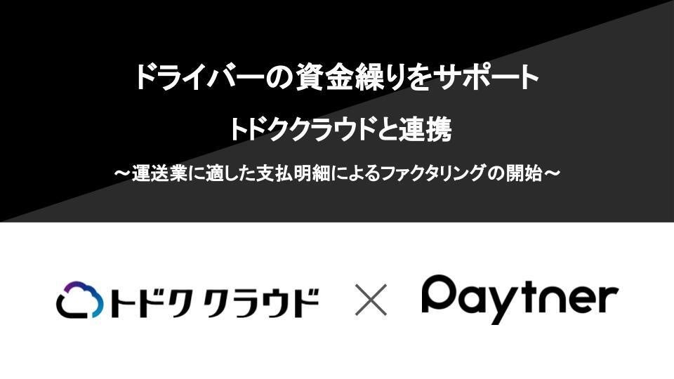 ペイトナー株式会社(本社:東京都港区、代表取締役:阪井優、以下ペイトナー)は、当社が提供する個人事業主・フリーランス資金繰り改善をサポートする請求書前払いサービス「ペイトナーファクタリング」と、物流ラストワンマイルにおける課題解決を目指す207株式会社(本社:東京都⽬⿊区、代表取締役:⾼柳慎也、以下「207」)が提供するトドククラウドとの連携を2023年11月30日(木)に開始しました。この連携によりトドククラウドで発行される支払明細からスムーズにファクタリングを実行できるようになりました。
