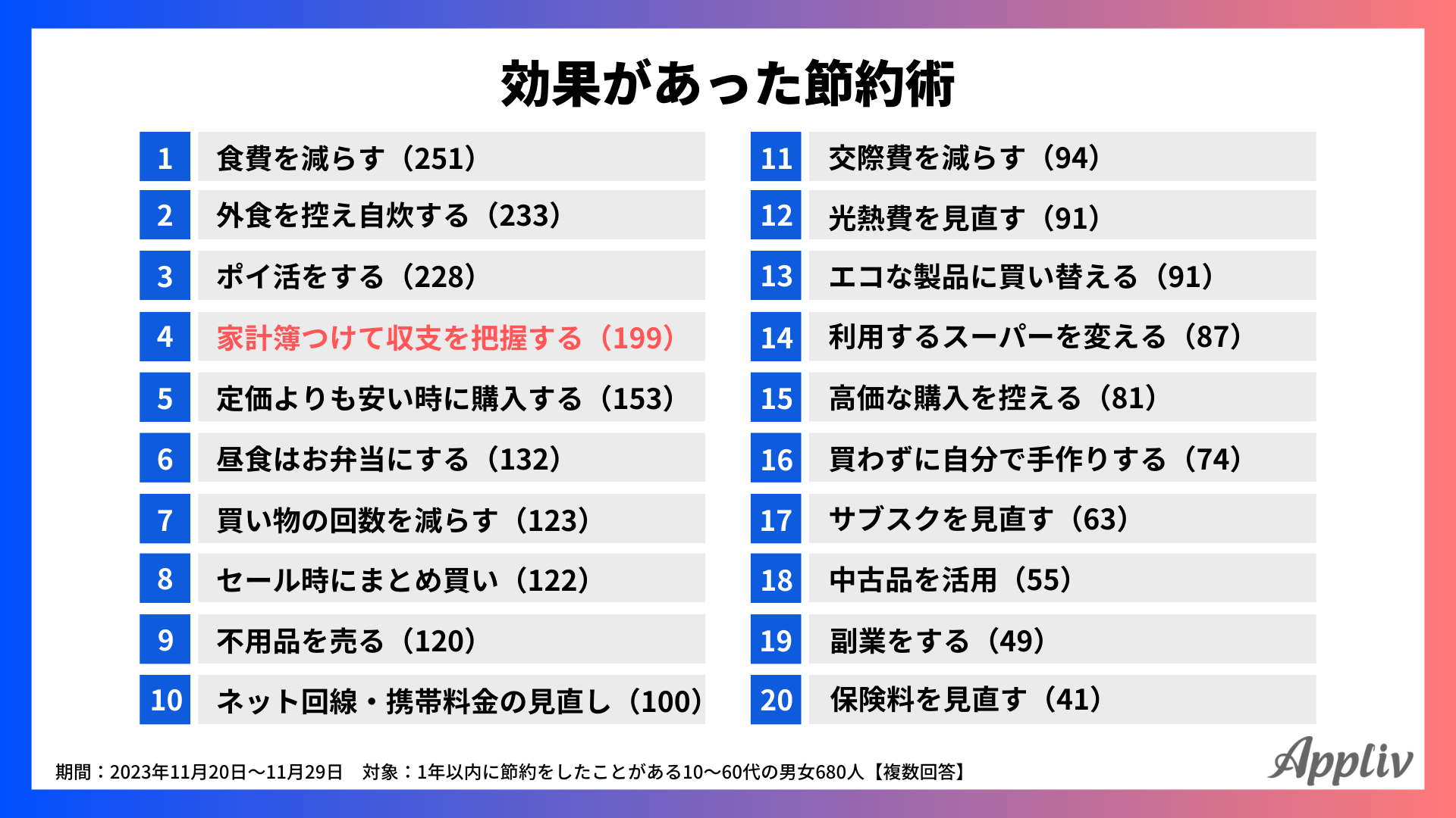 効果があった節約術TOP3は「食費を減らす」「自炊」「ポイ活」、約3割は「家計簿」を活用